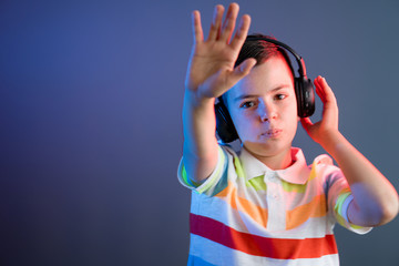 Boy Using Monopod On Blurred Background Funny Stylish Child