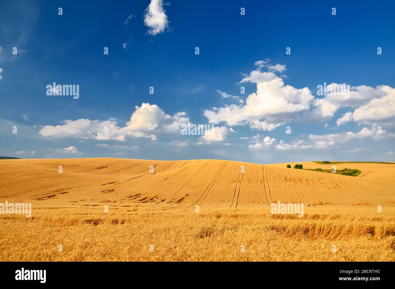 Spring Green Agricultural Field Under Clear Blue Cloudy Sky
