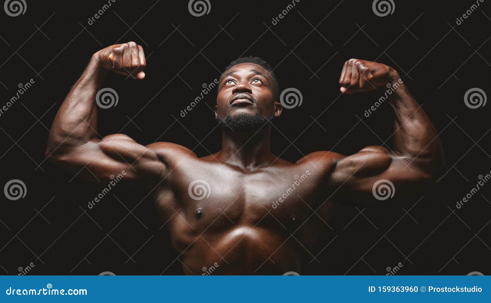 Artistic Black Athlete Flexing Biceps Over Black Background Stock