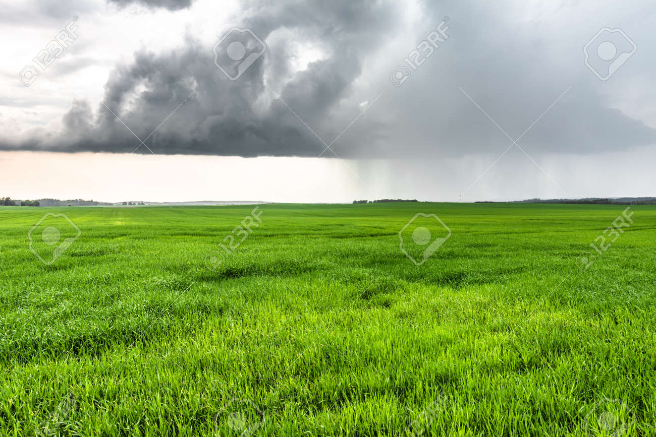 Rain Cloud Over Green Field Landscape Minimalist Scene Of