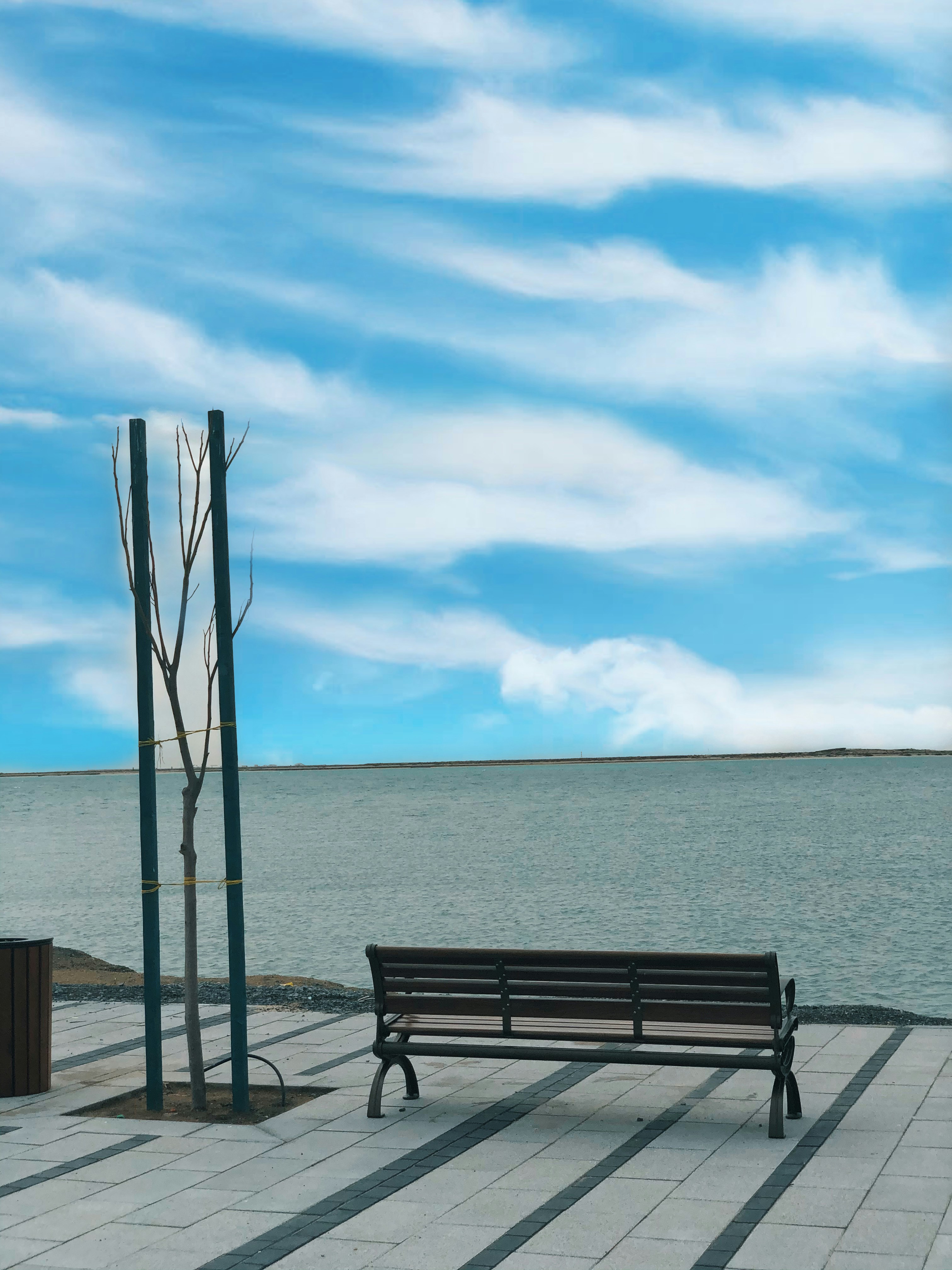 Two Person Sitting In Bench In Front Beach Under Blue Sky Free