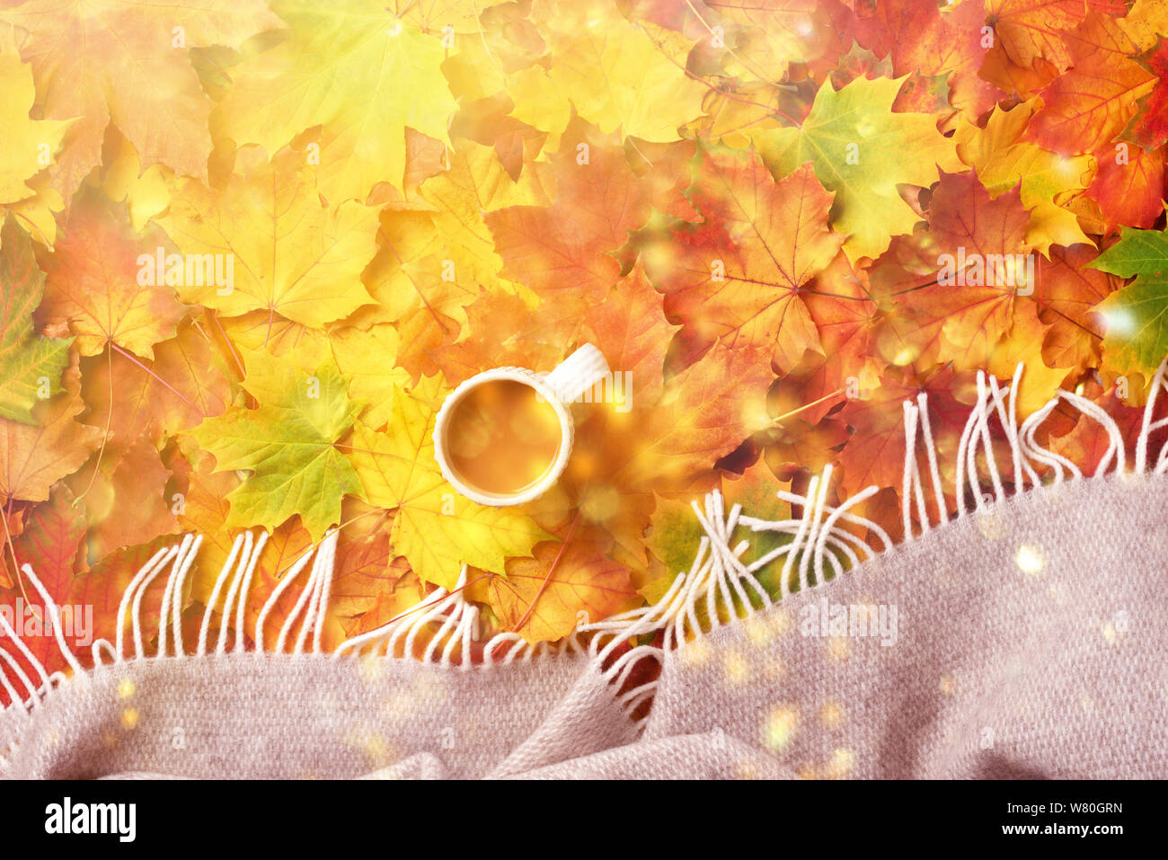 Cup Of Warm Drink Beige Plaid Over Colorful Maple Leaves