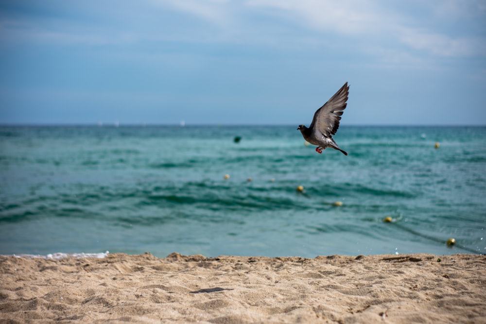 Grey Bird Flying Above People In The Beach Photo Free Animal