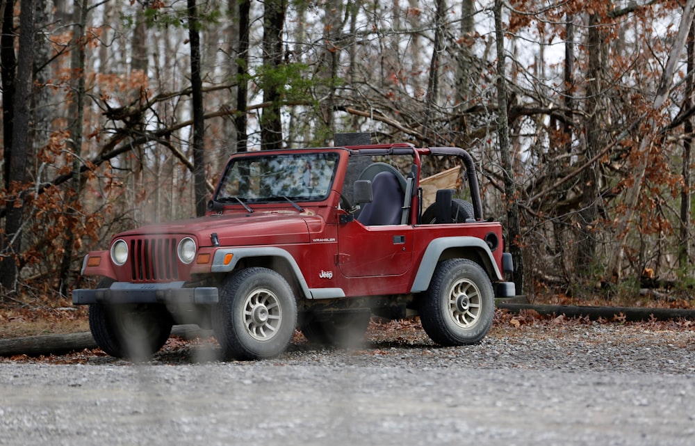 Red Jeep Wrangler On Park Beside Road In Middle Of Woods Photo