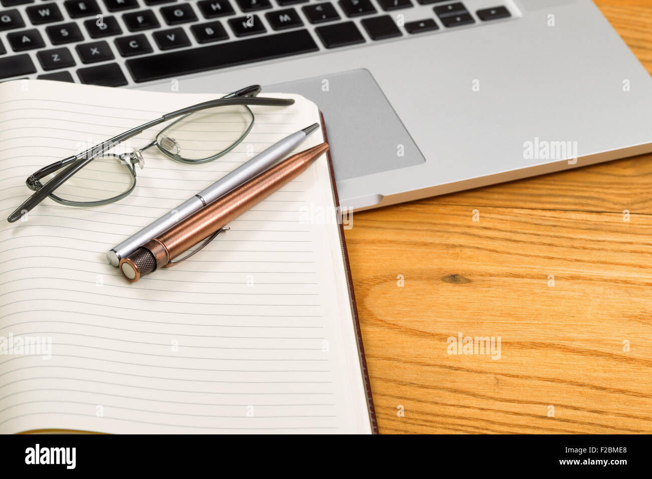 Close Up Of Pens Selective Focus On Pens With Open Blank Notebook Stock Photo 87538704 Alamy