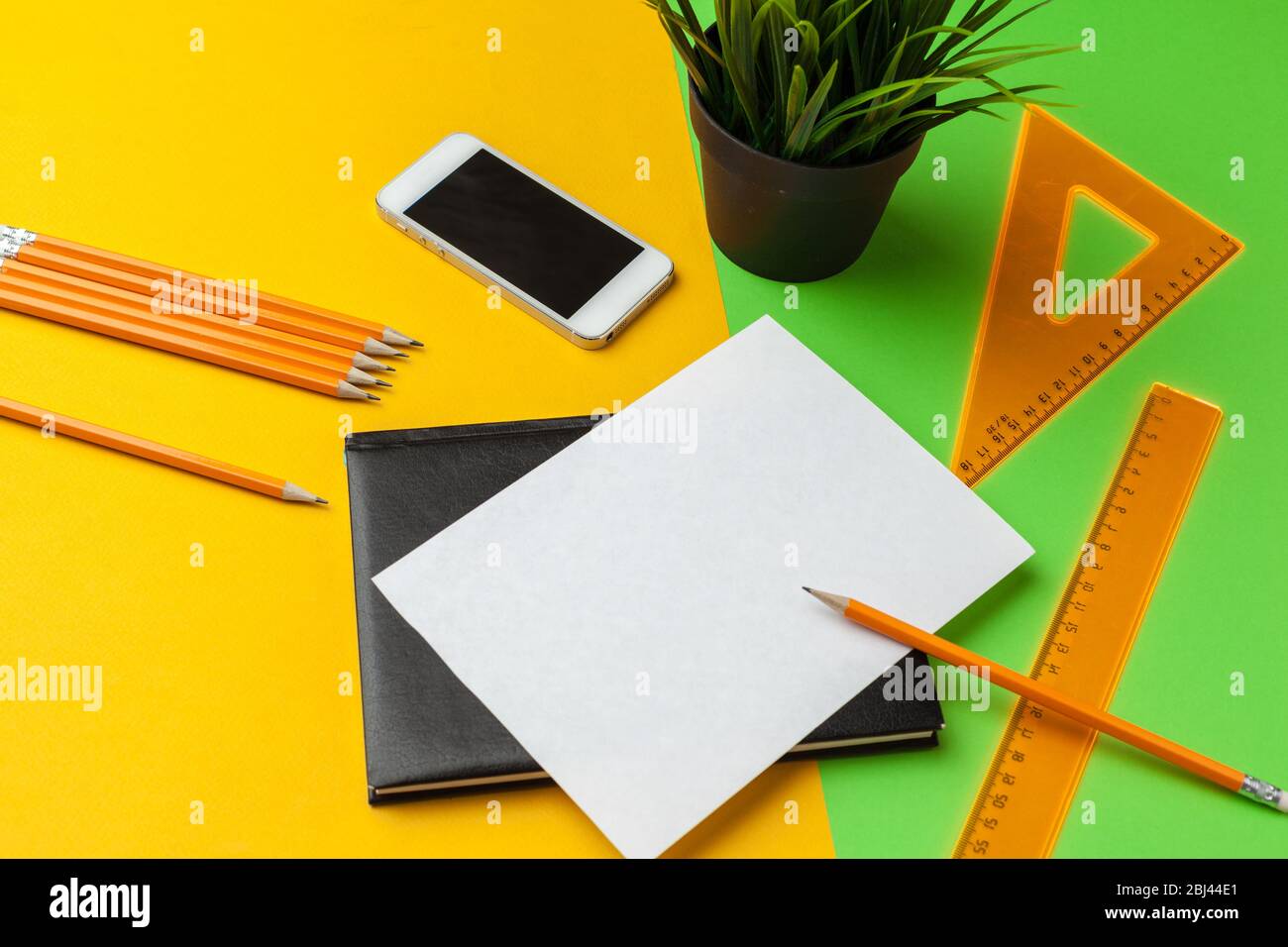 Blank Paper With Smart Phone On Desk Top View Flat Lay Stock Photo