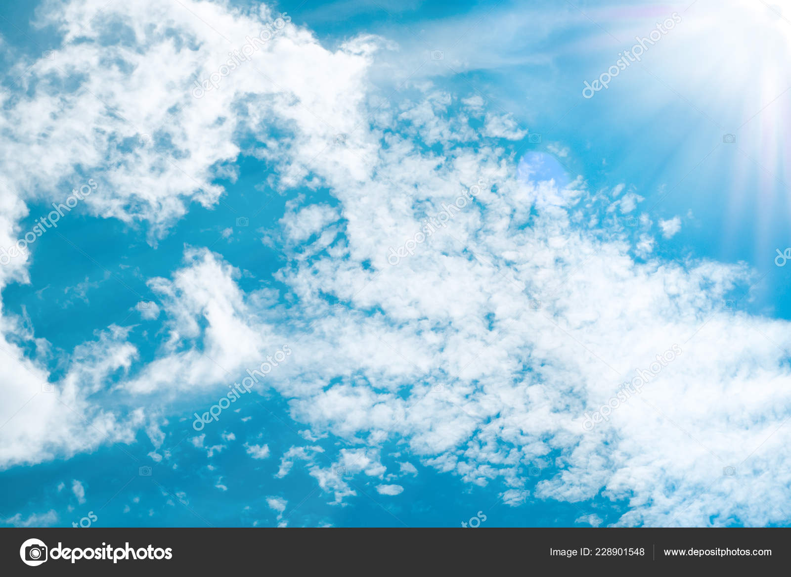 Sun Beams Lighting White Clouds Bright Blue Sky Background