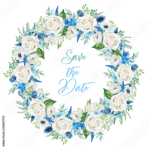 Watercolor Floral Illustration Wreath With Bright White Blue