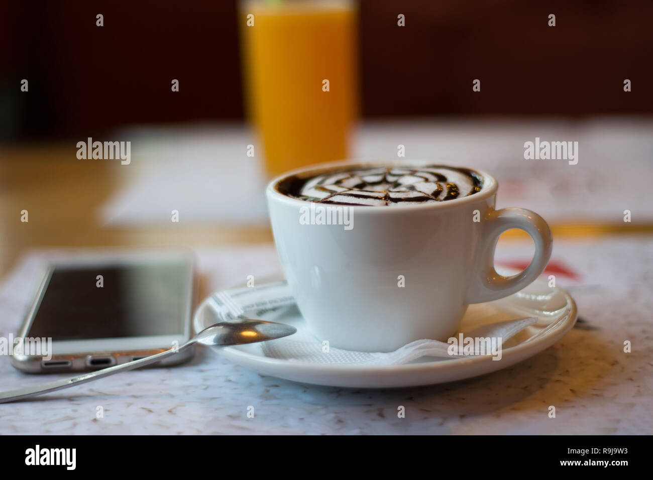 Still Life With A Cup Of Flavored Cappuccino A Phone On The