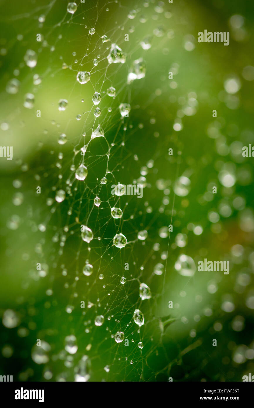 Close Up Spider Web Decorated By Rain Drops With Blurred Colorful
