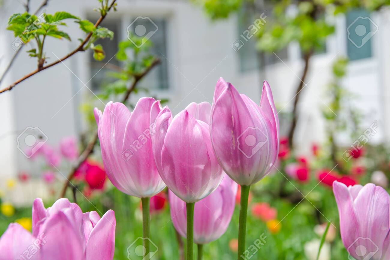 Group Of Beautiful Pink And Red Tulips With Blurred Green