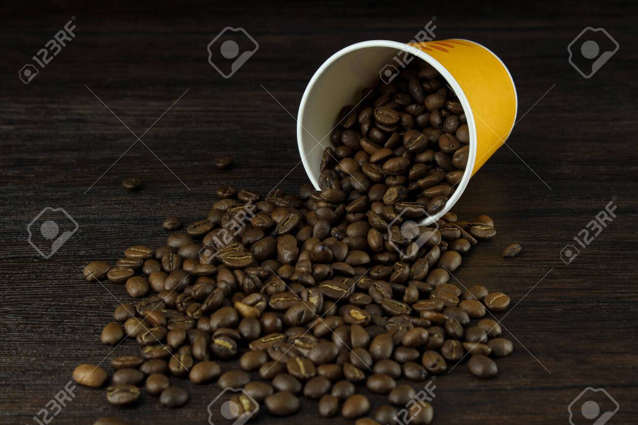 Scattered Coffee Beans And Coffee Cup On A Wooden Board Close Up