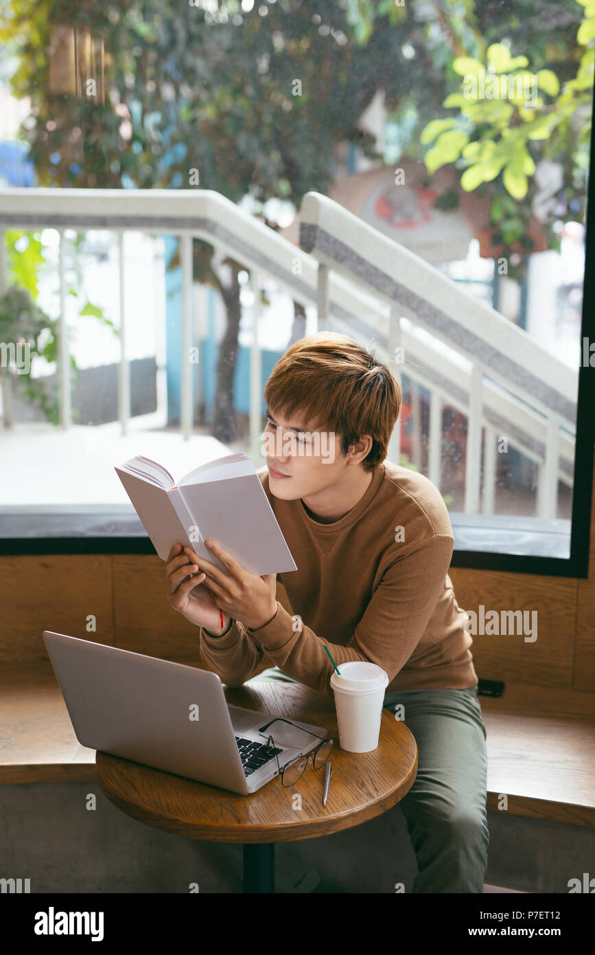 Pensive Young Asian Businessman Reading Book At Desktop With