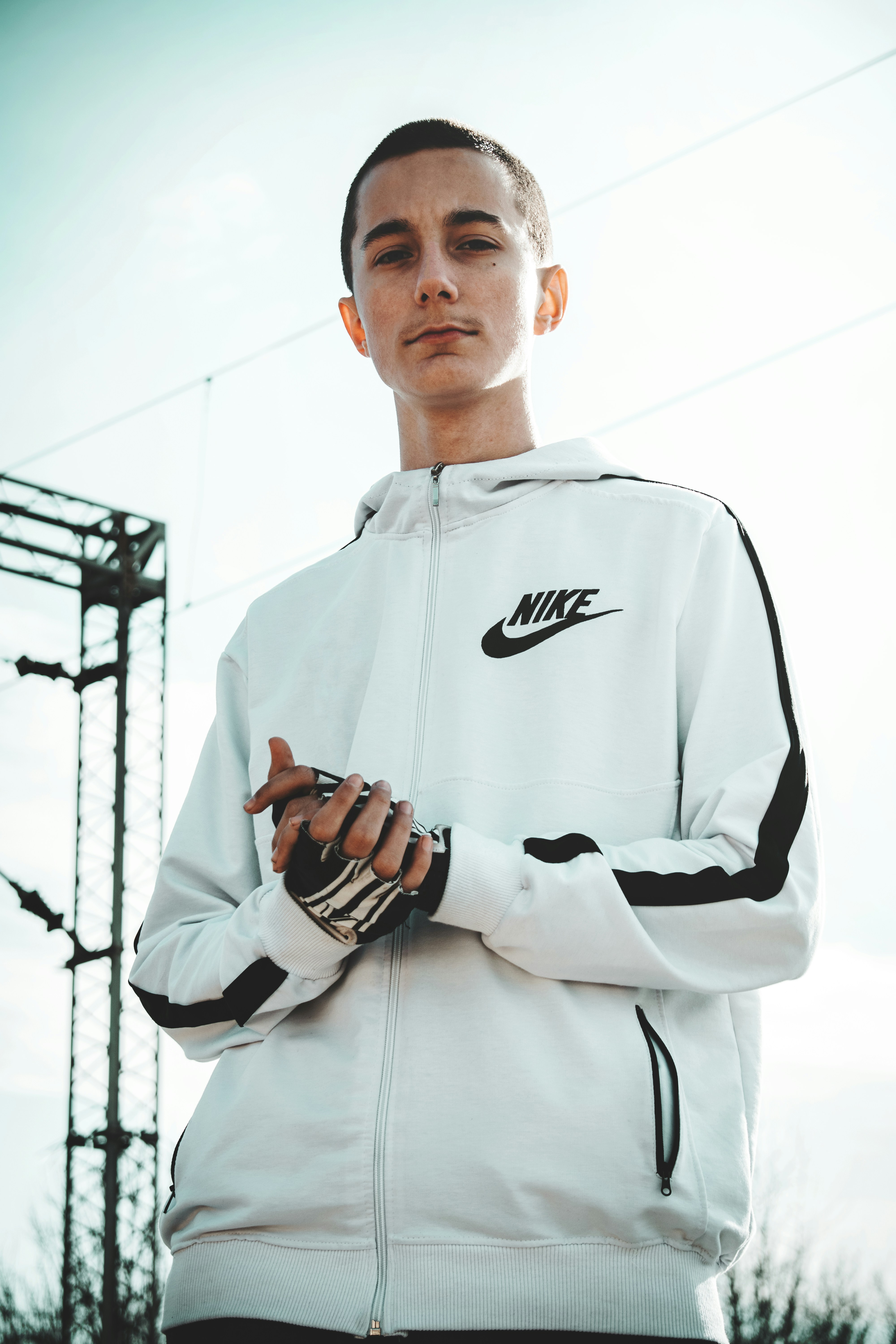 Man Wearing White And Black Full Zip Nike Hoodie Standing Across