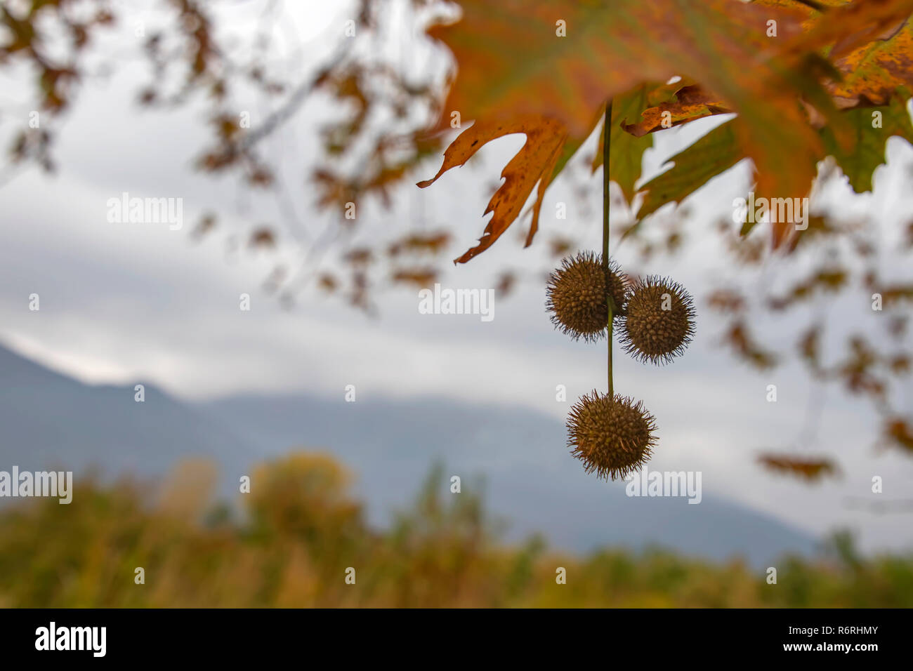 Tree Branches With Autumn Leaves And Fruits On A Blurred