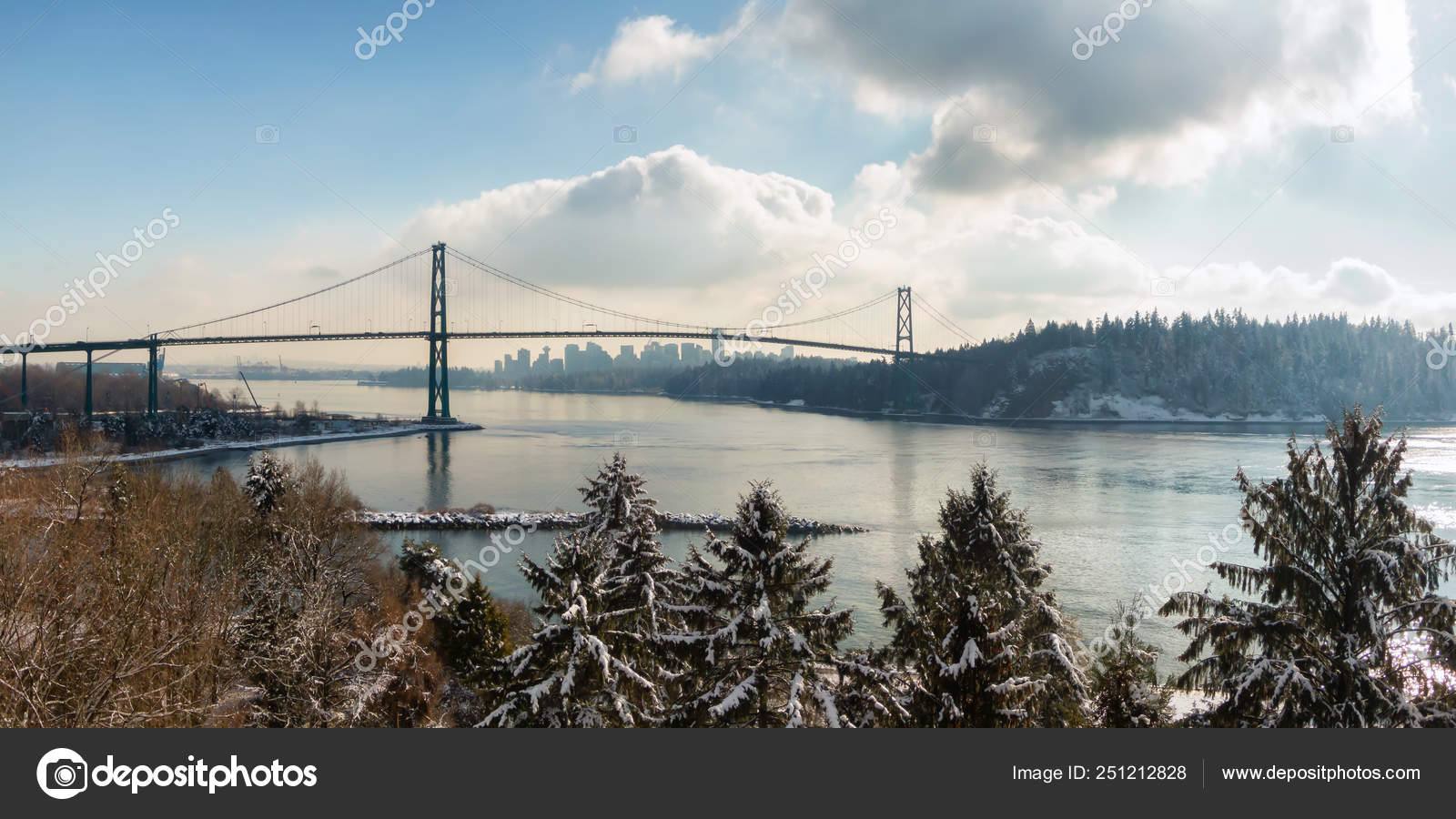Aerial Panoramic View Lions Gate Bridge Vibrant Winter Day Taken