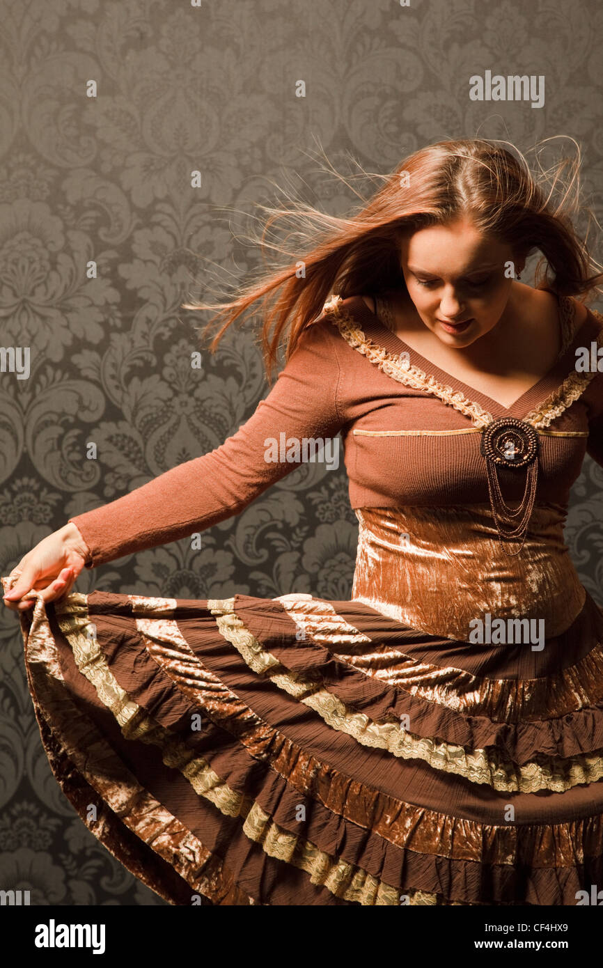 Woman In Brown Dress Standing Beside Wall Keeps Bottom Her Skirt