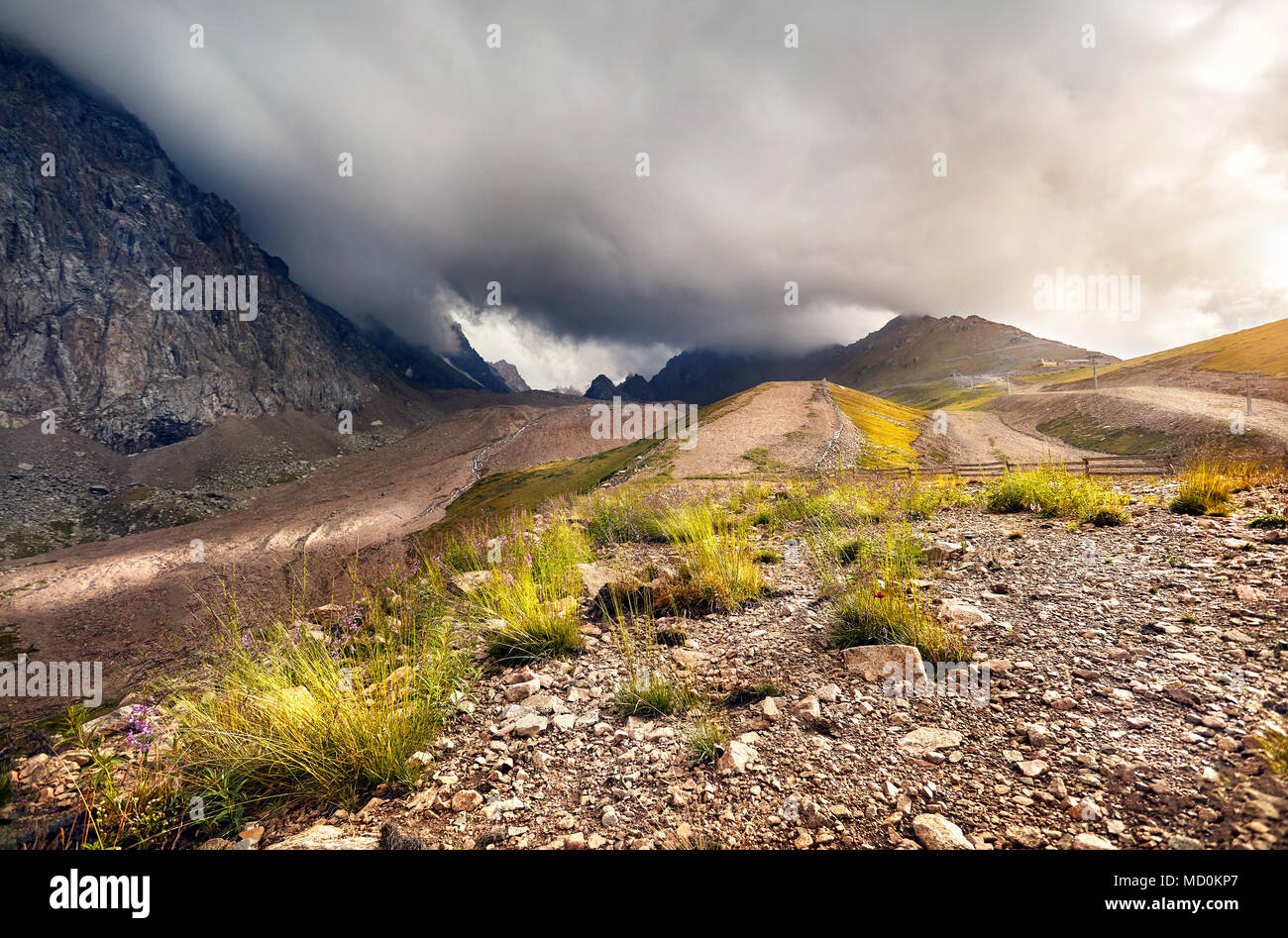 Landscape Of Mountain Valley At Sunset Cloudy Sky Background In