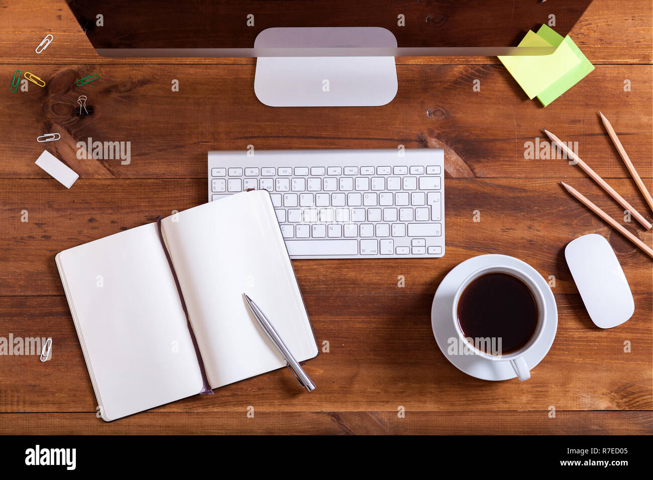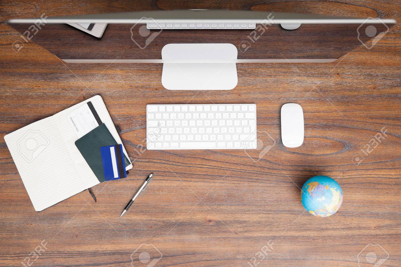 Top View Of A Wooden Desk With A Desktop Computer And A Passport