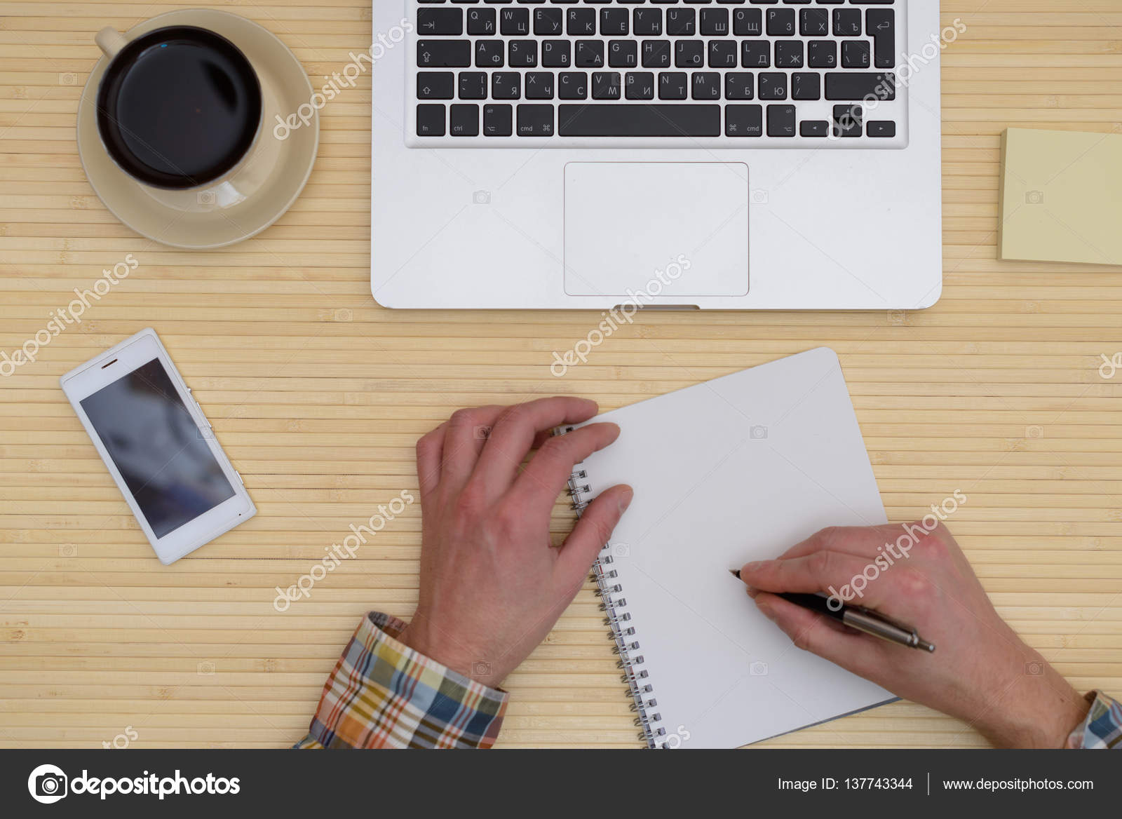 On Top Of The Laptop Camera Coffee Cup Hand Writes In A Notebook