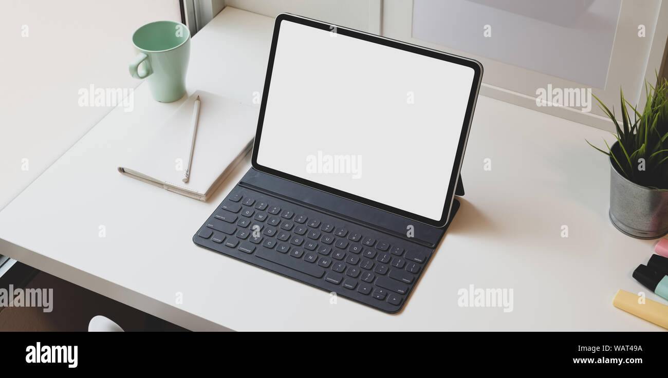 Minimal Comfortable Workplace With Blank Screen Tablet And Cup Of