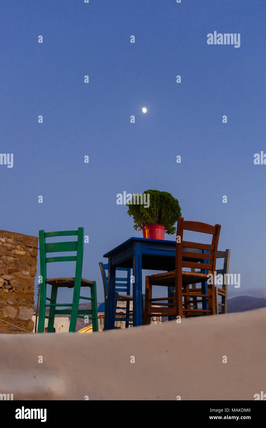 A Small Blue Table With Four Multicolored Chairs On The Terrace At