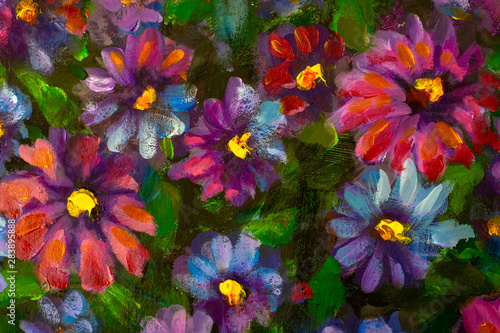 Red Violet Flowers Wildflowers Daisies In Green Grass Close Up Oil