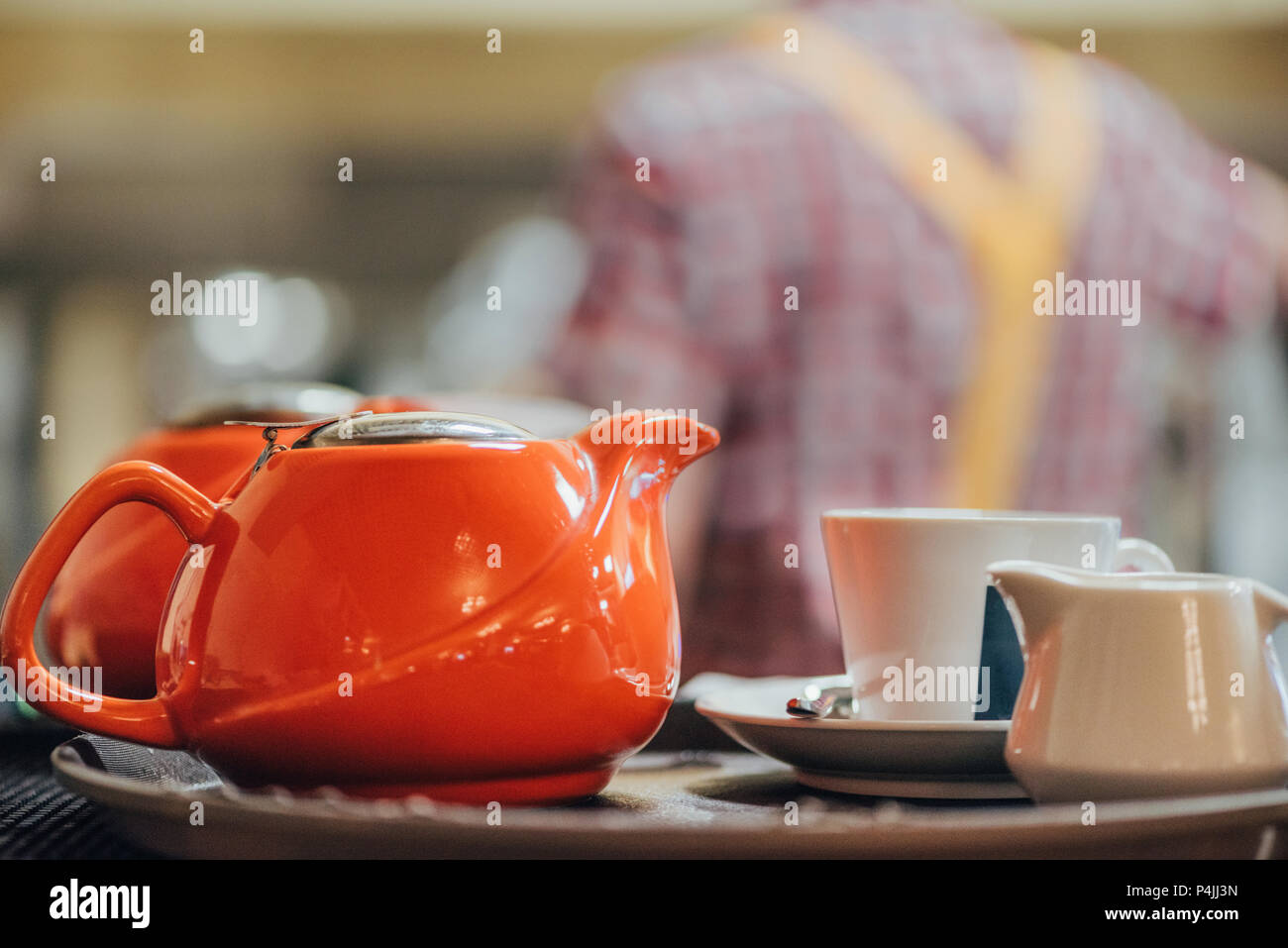 Close Up View Of Red Porcelain Kettle Cup And White Jug On Table