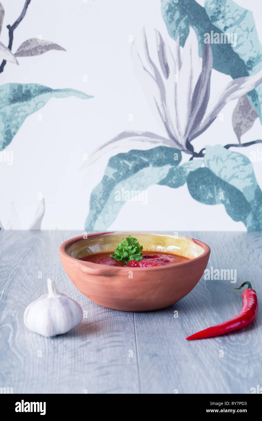 Tomato Sauce In A Bowl With Fresh Herbs Chili And Garlic Infront