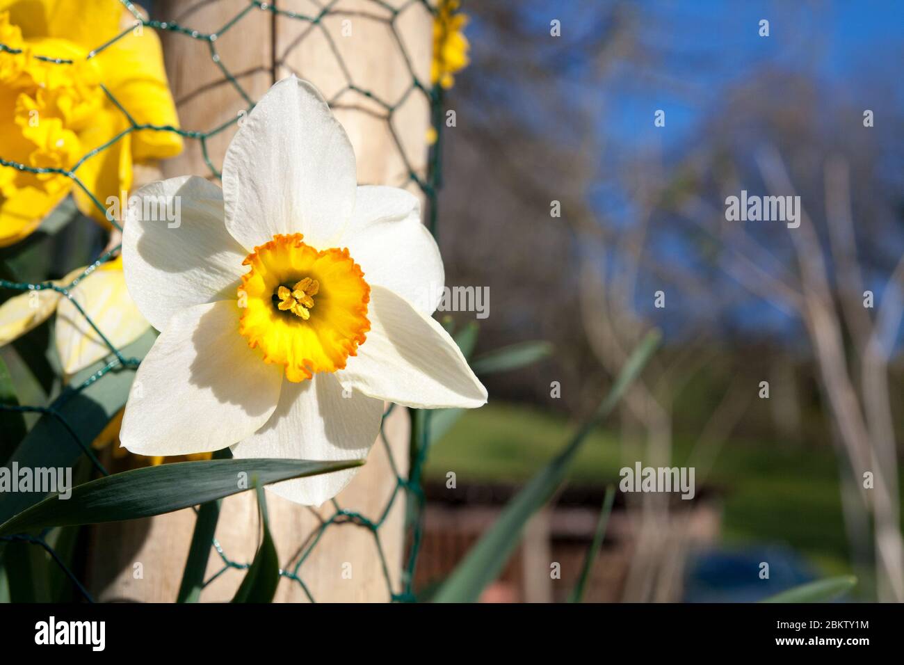 Single Daffodil Close Up Of The Blossom With The Chain Link Fence