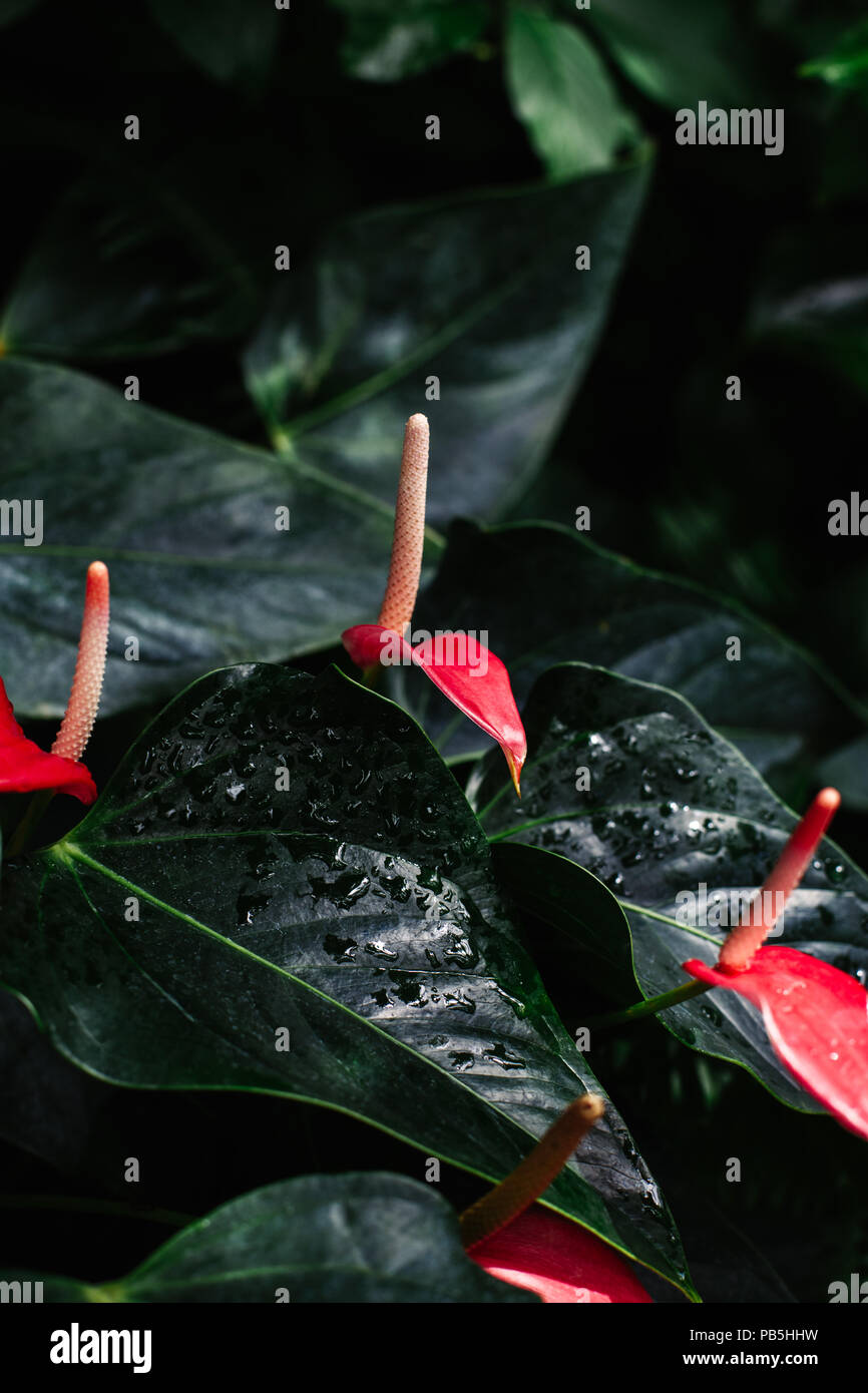 Closeup Macro Shot Of Few Many Red Flowers Anthurium With Dark