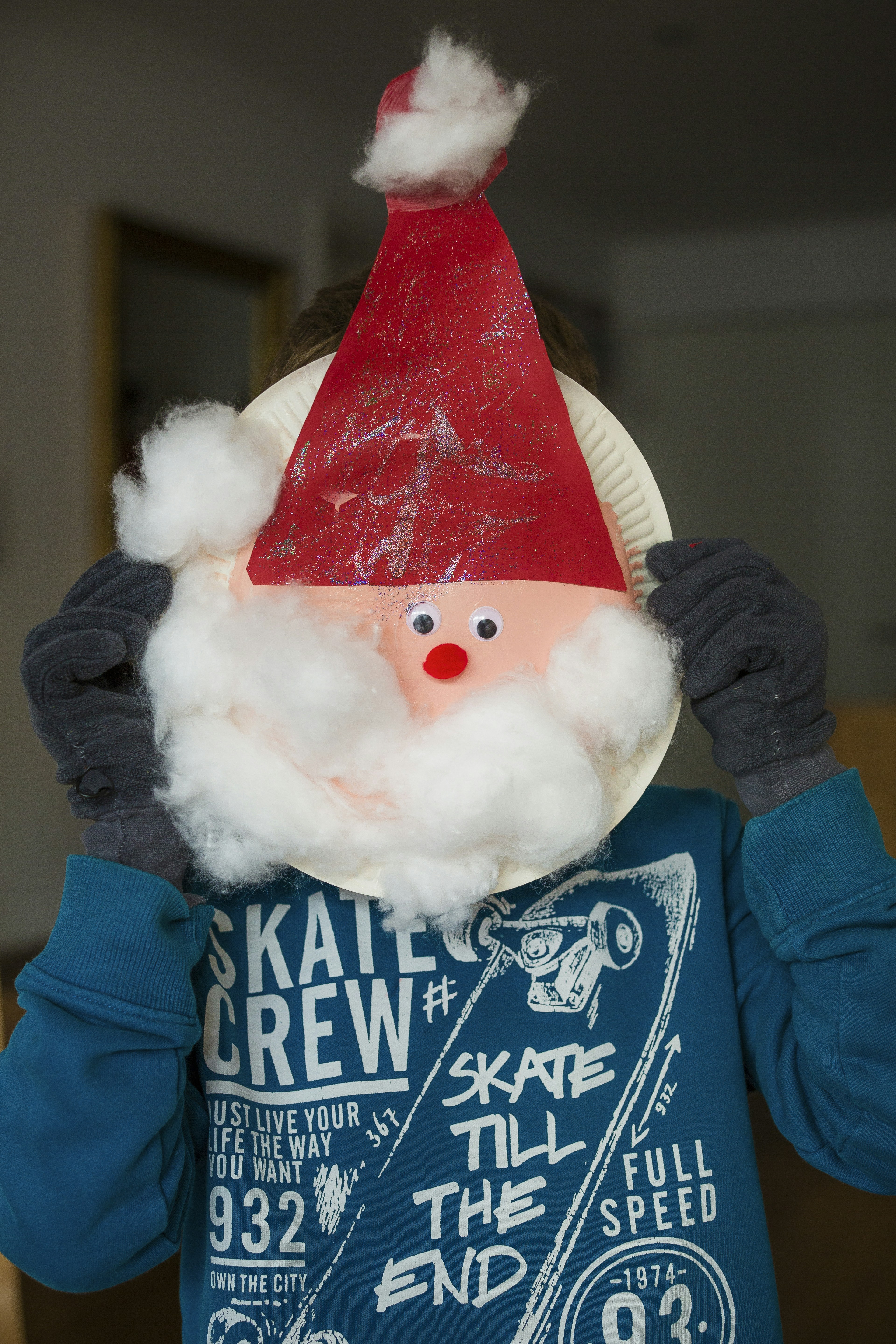 Person Holding White Paper Plate With Santa Head Inside Room Photo