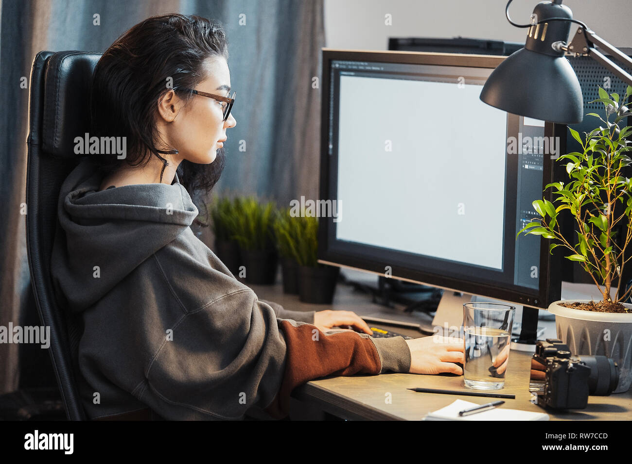 Young Attractive Woman Freelancer Designer Working On Pc At Home
