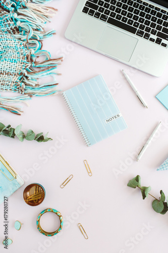 Flat Lay Home Office Desk Women Workspace With Laptop On Pale