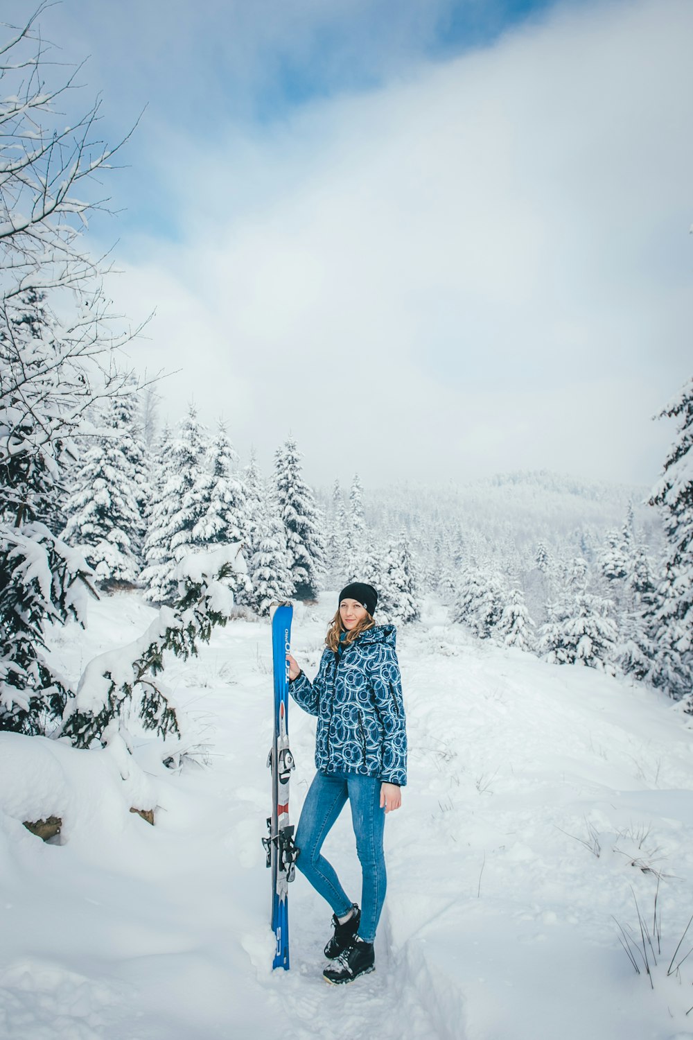 Woman Standing On Snow Mountain Holding Snow Skis Photo Free
