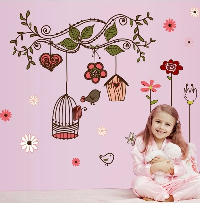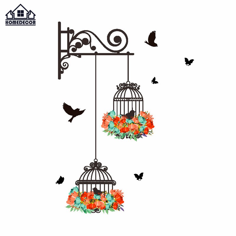 Hd Flying Birds Wall Sticker Flower Birdcage Creative Home Decor