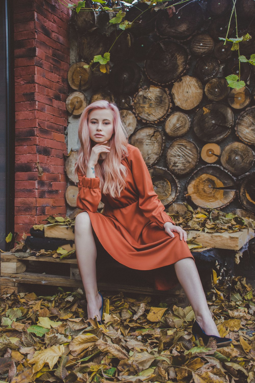 Woman Sitting On Wooden Pallet With Her Fingers On Her Chin Beside