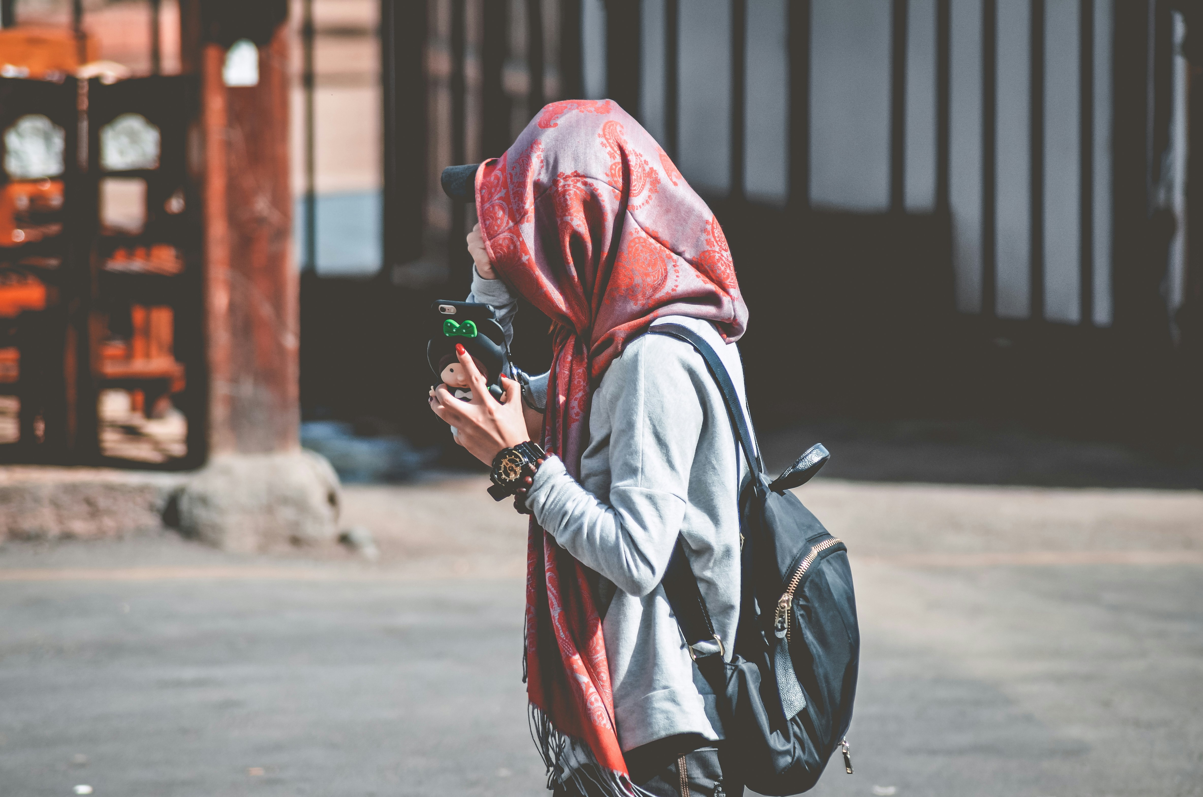 Photo Of Woman Wearing Red And Grey Floral Hijab Scarf And