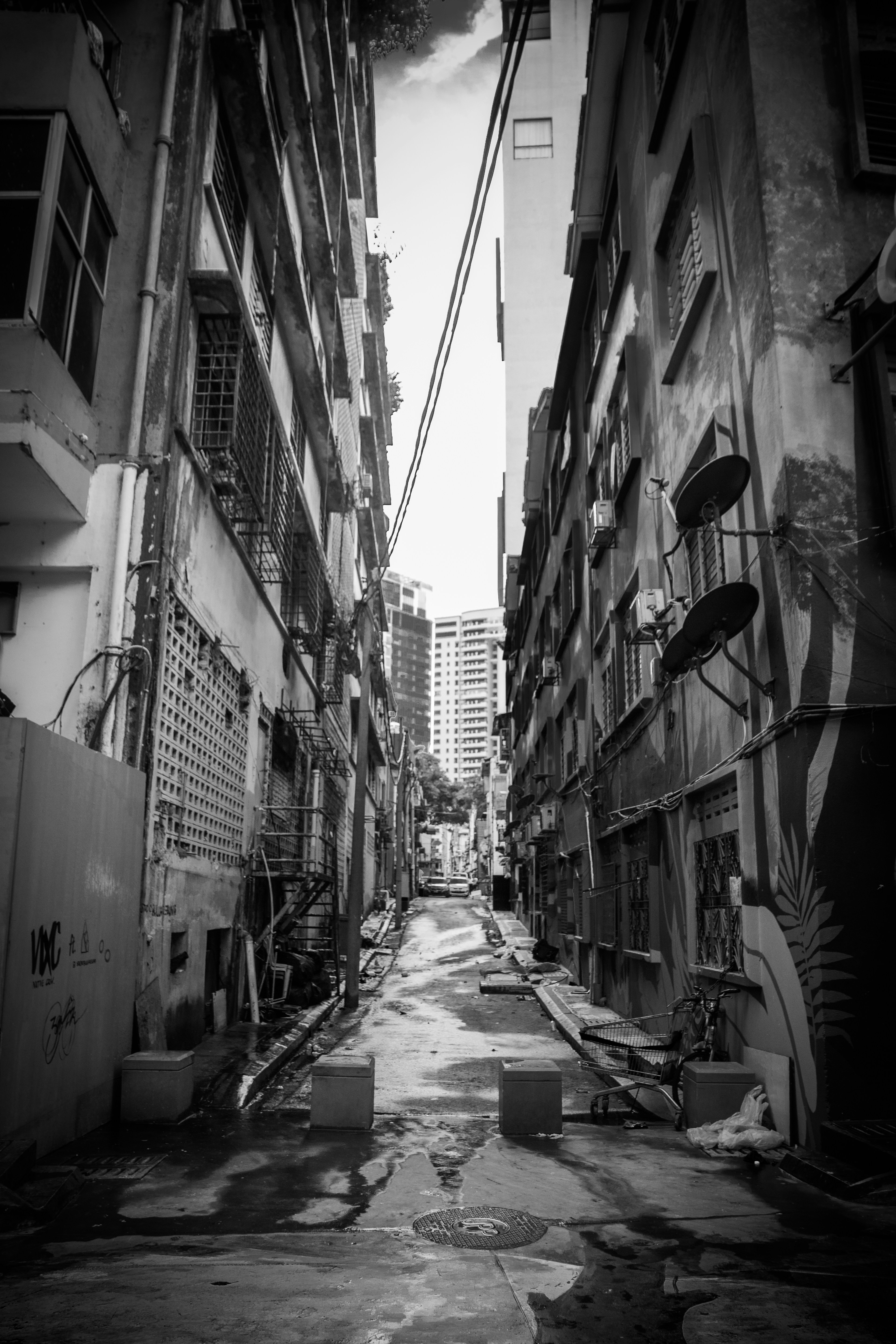 Grayscale Photography Of Pathway Between Buildings Photo Free