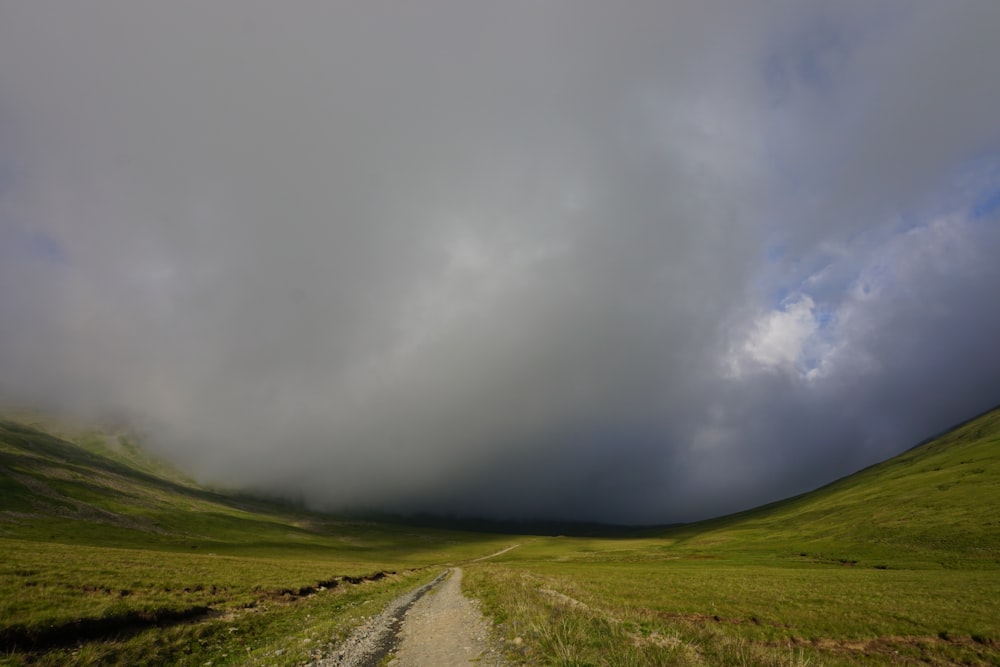 Brown Dirt Road Between Green Grass Field Under White Clouds And