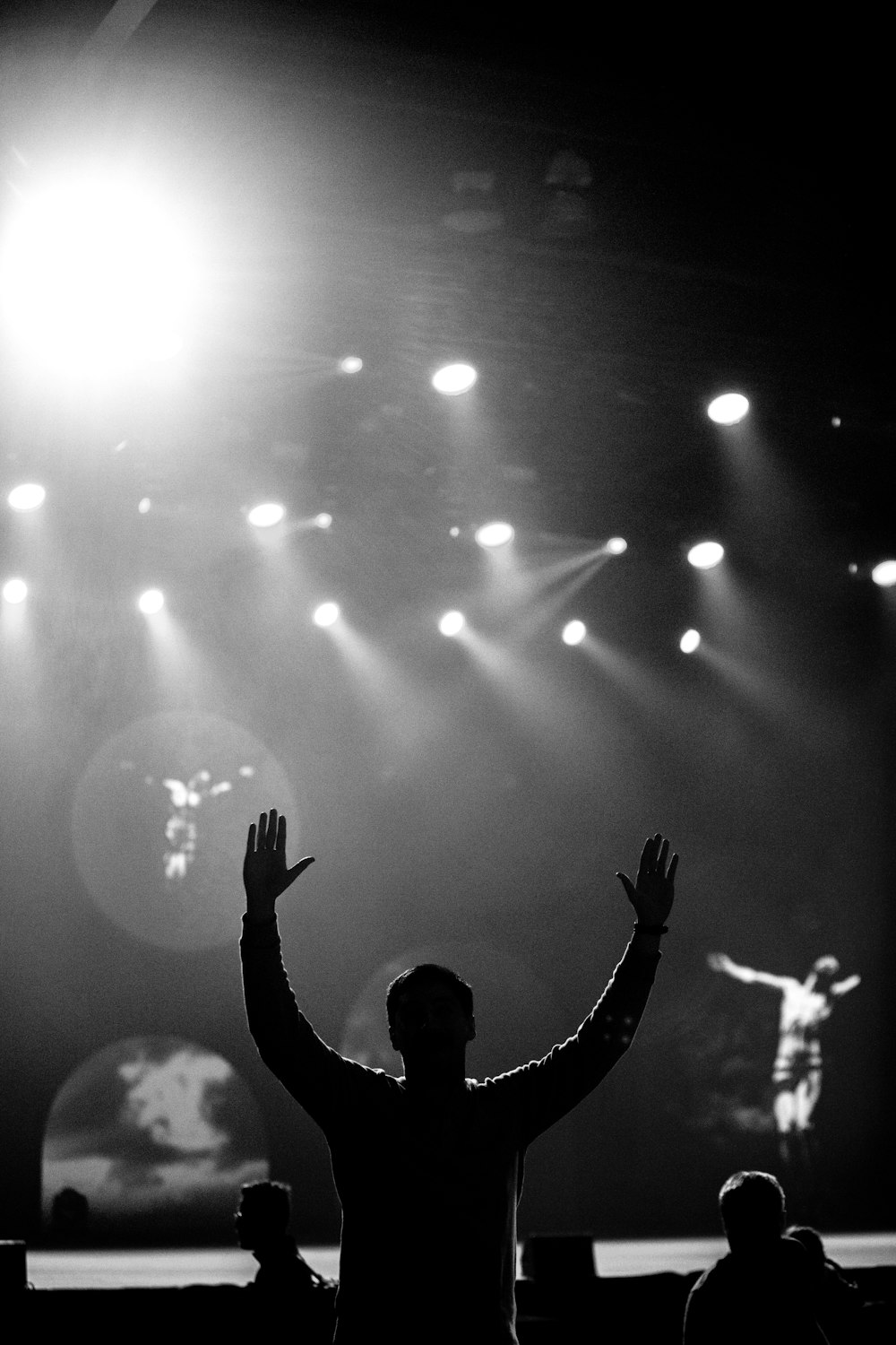 Grayscale Photo Of Man In Crew Neck Shirt Raising Both Hands Photo