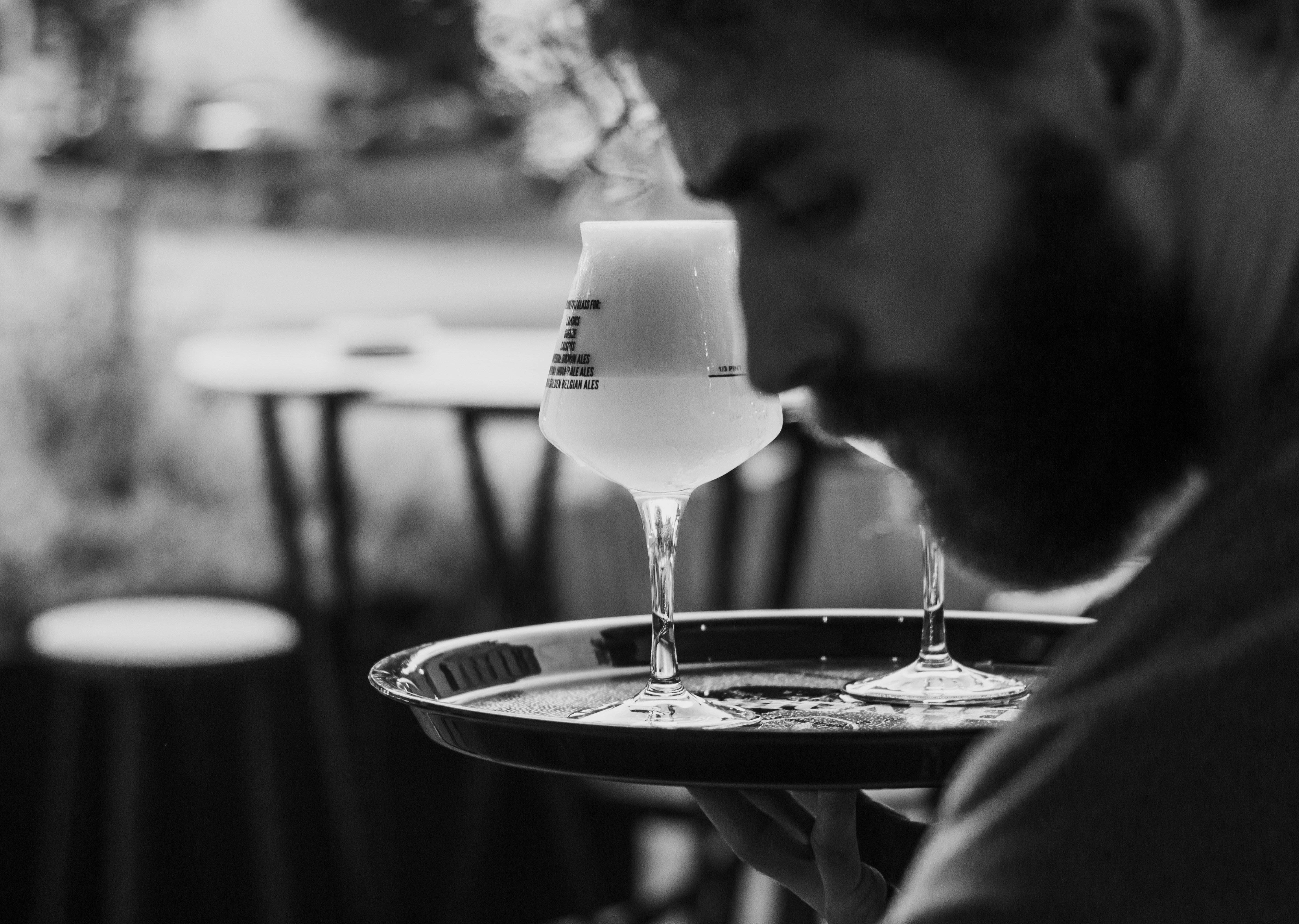 Grayscale Photo Of Man Holding Black Tray With Two Wine Glasses