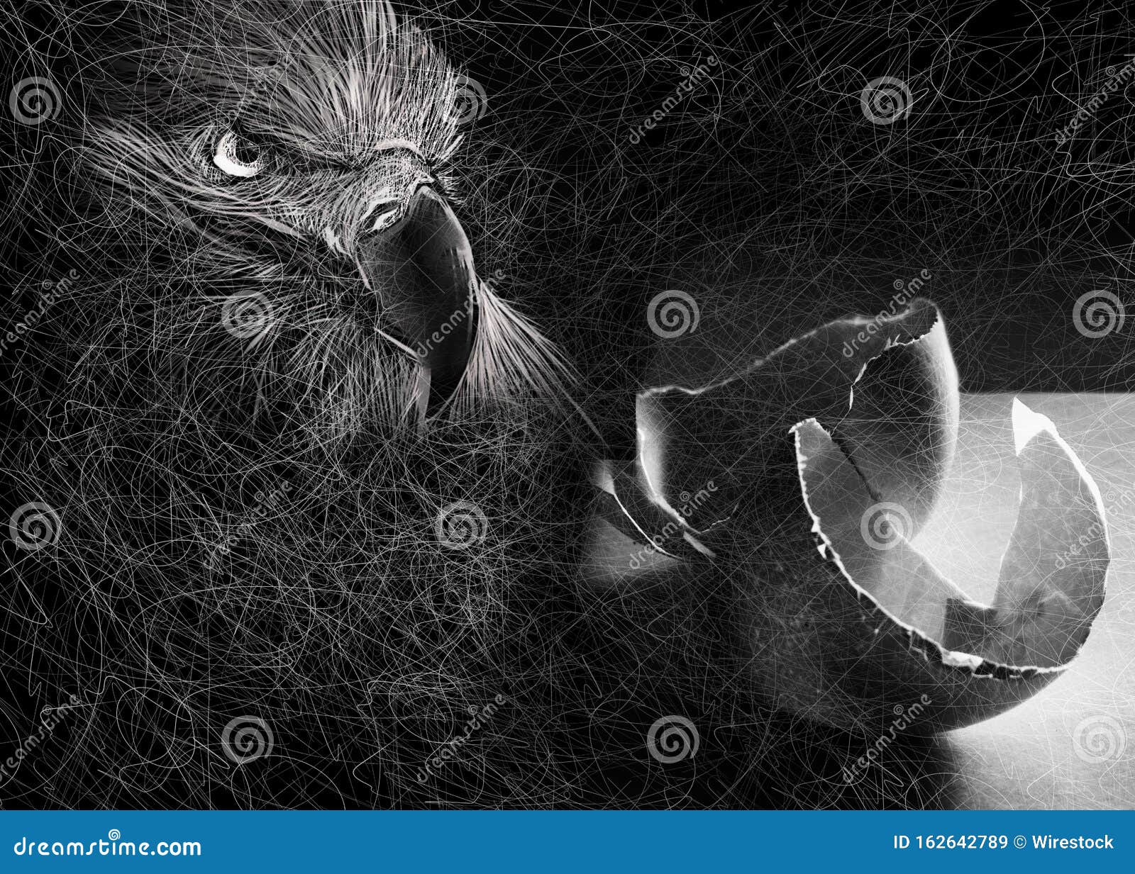 Grayscale Shot Of A Depiction Of A Figure Of A Hawk And Eggshells
