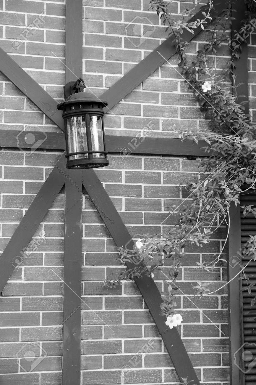 Glass Lantern On The Brick Wall In Grayscale Mode Stock Photo