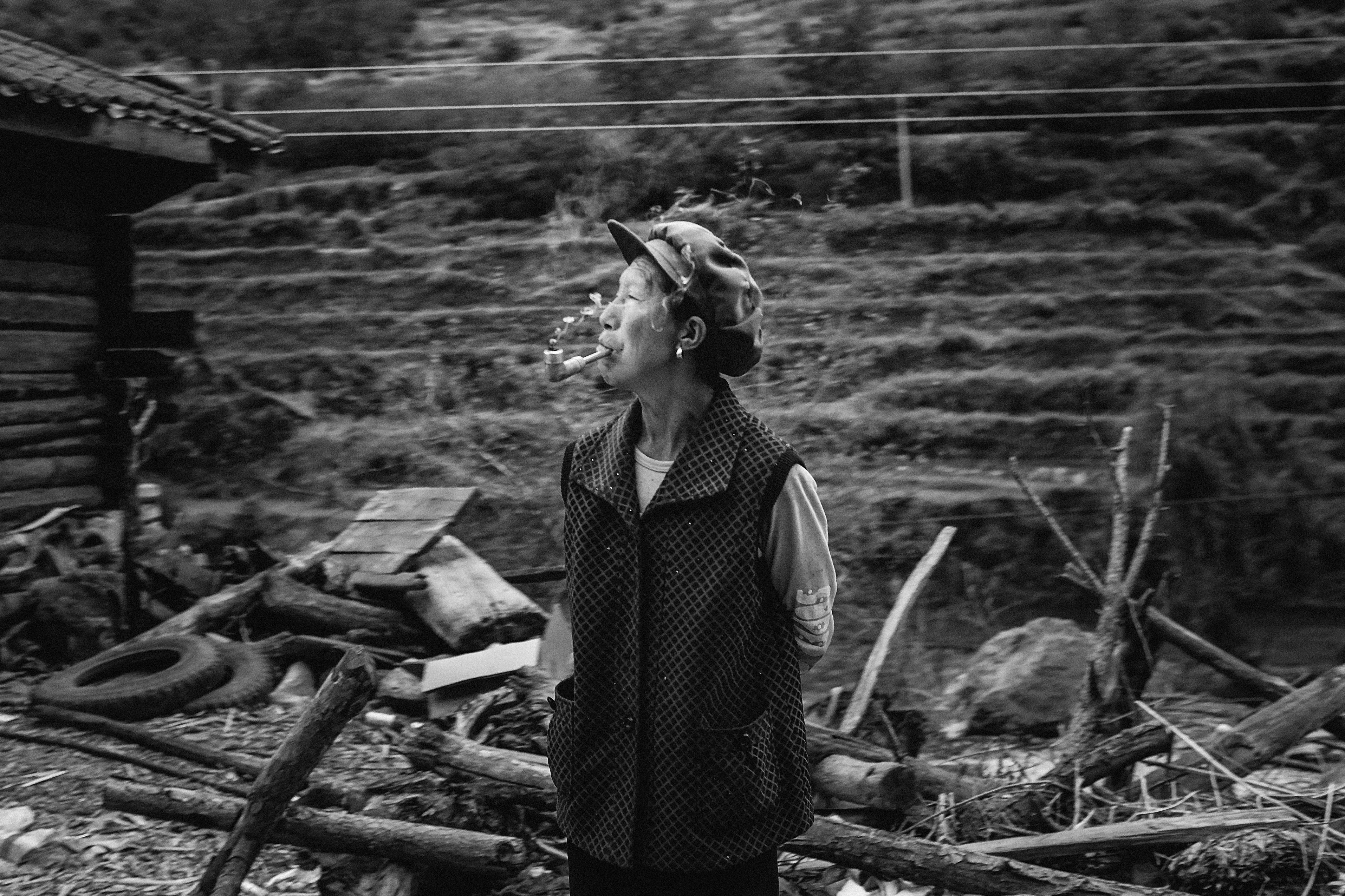 Grayscale Photo Of Man In Smoking Pipe In Village Free Stock Photo