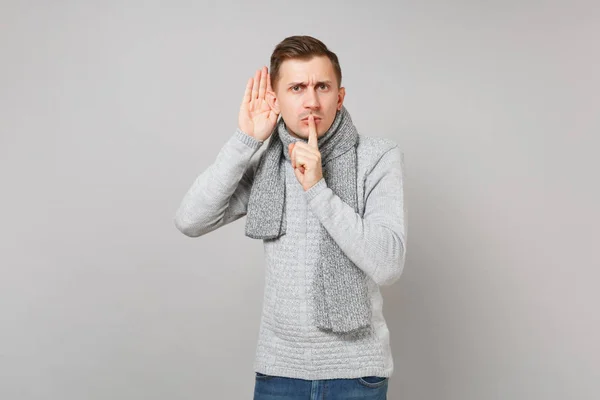 Shocked Young Man Gray Sweater Scarf Looking Aside Keeping Mouth