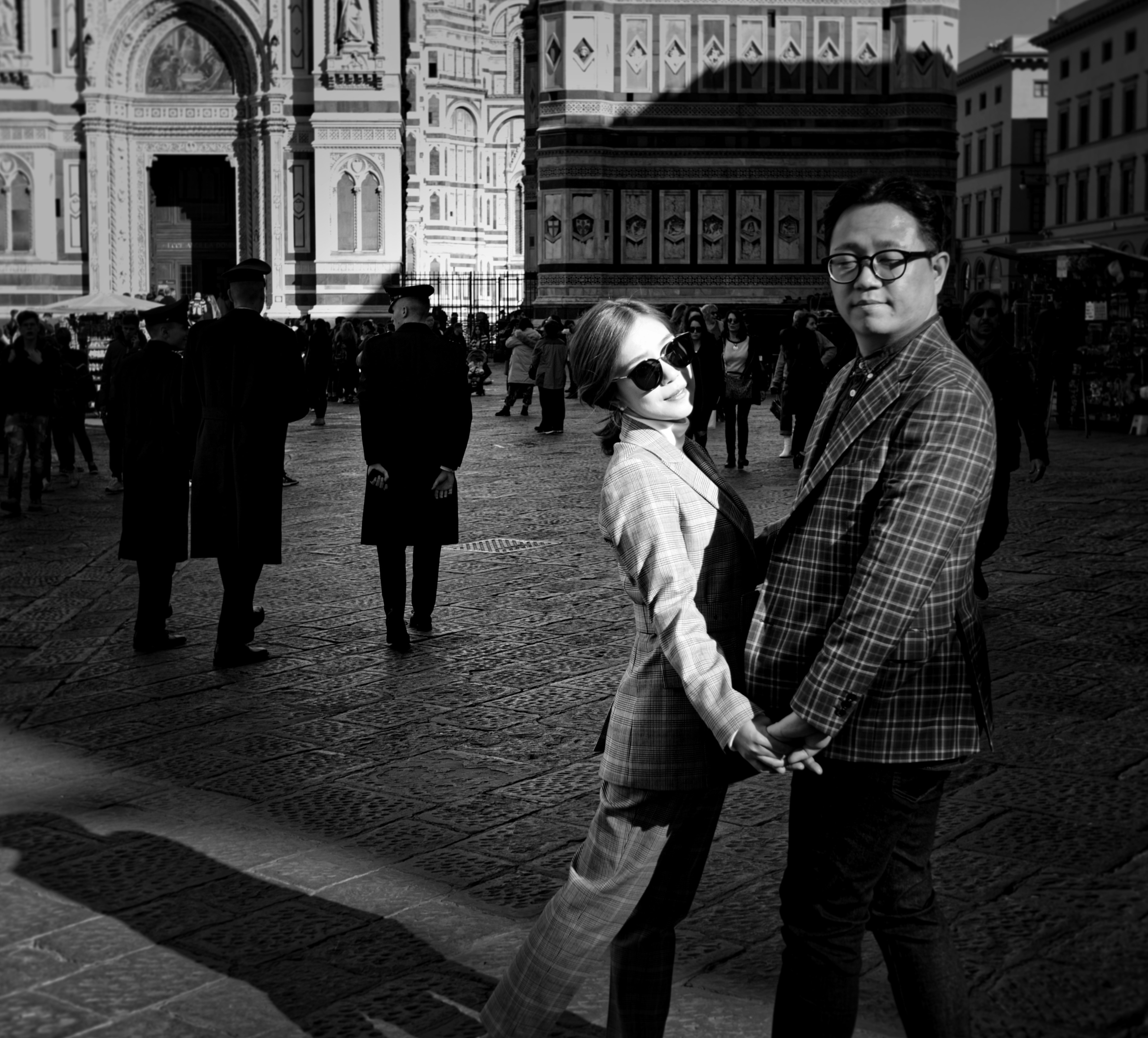 Grayscale Photo Of People Standing In Front Of Building Photo