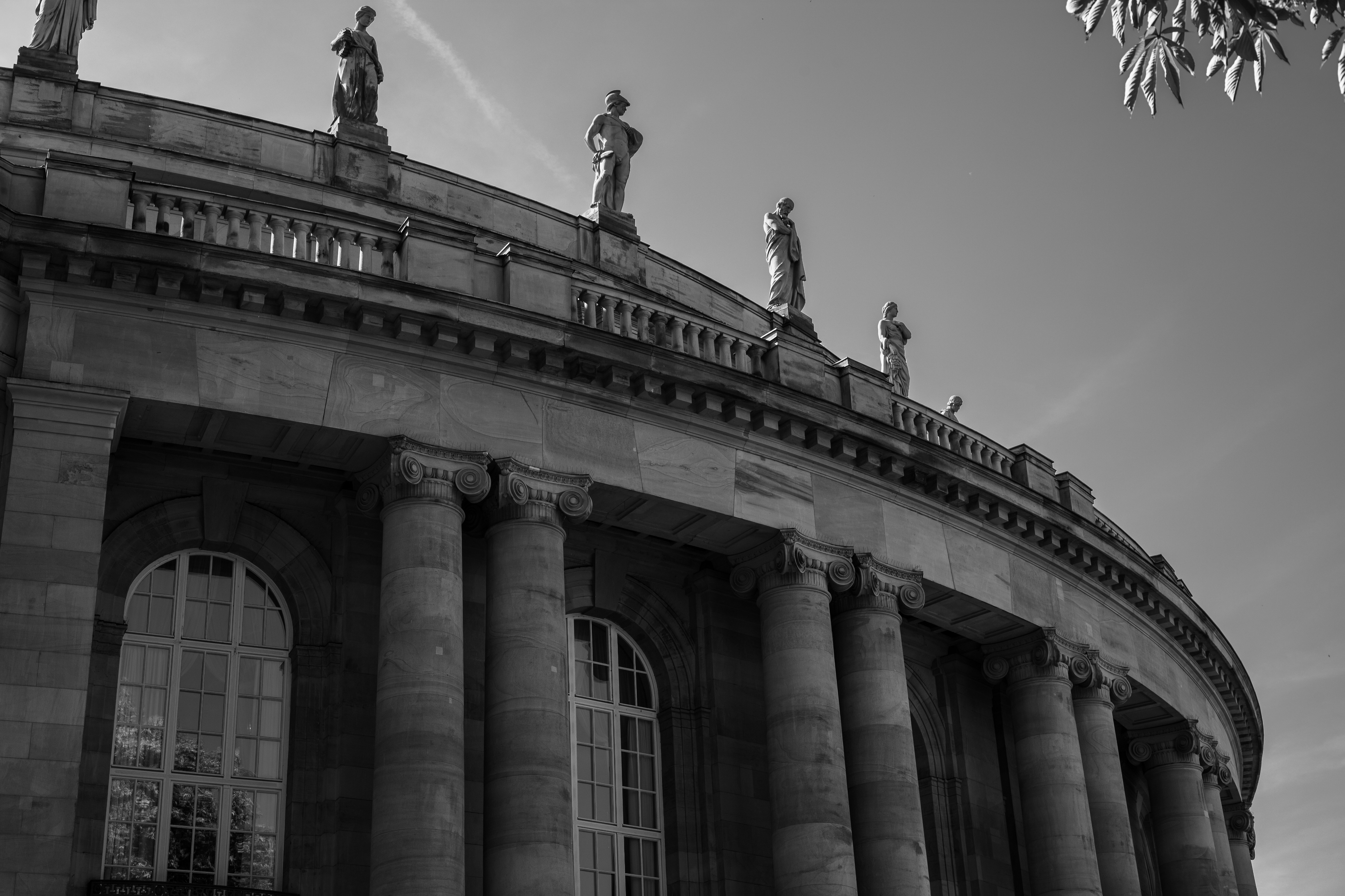 Grayscale Photo Of Concrete Building With People Standing Statue