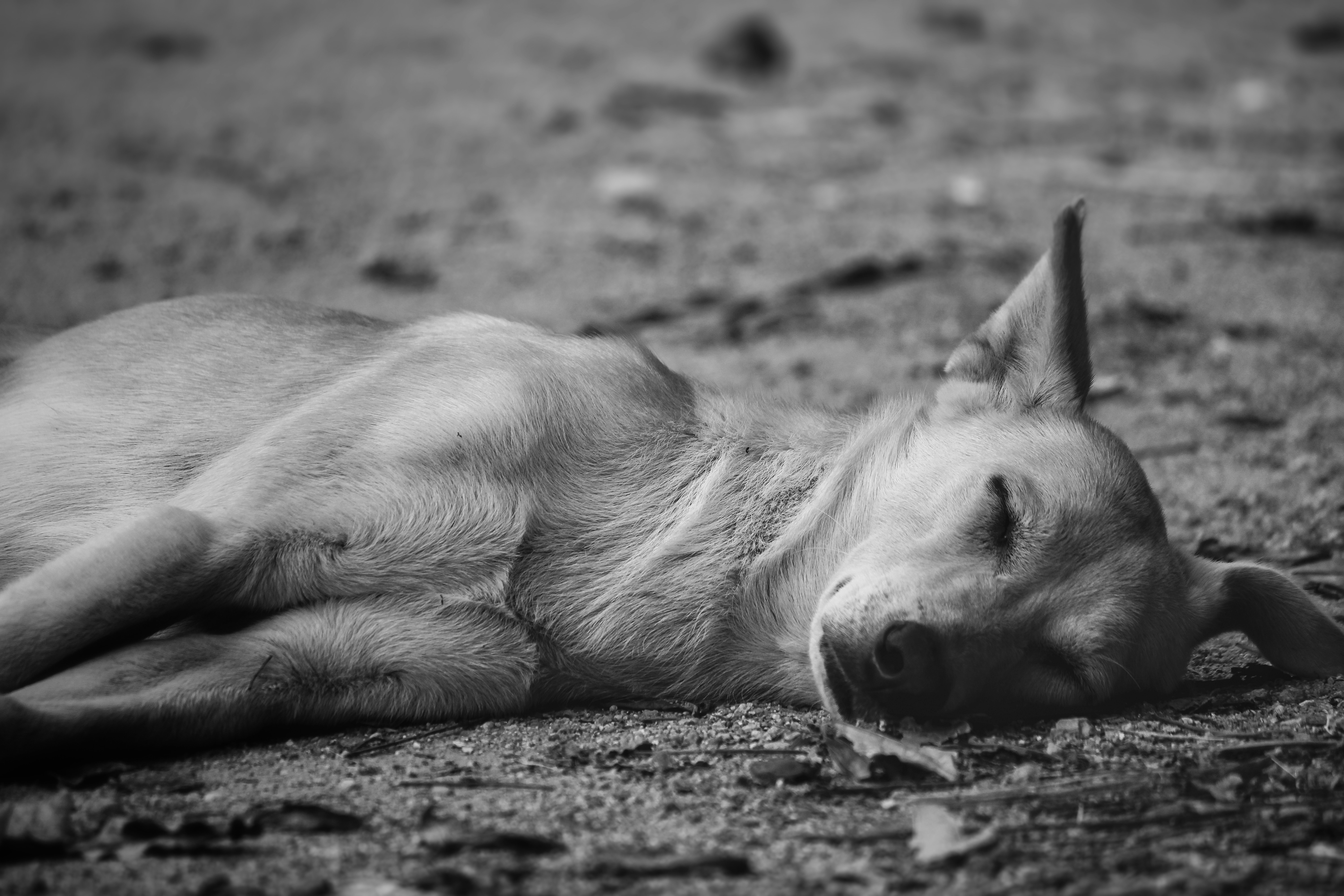 Grayscale Photography Of Short Coated Dog Lying On Ground Photo