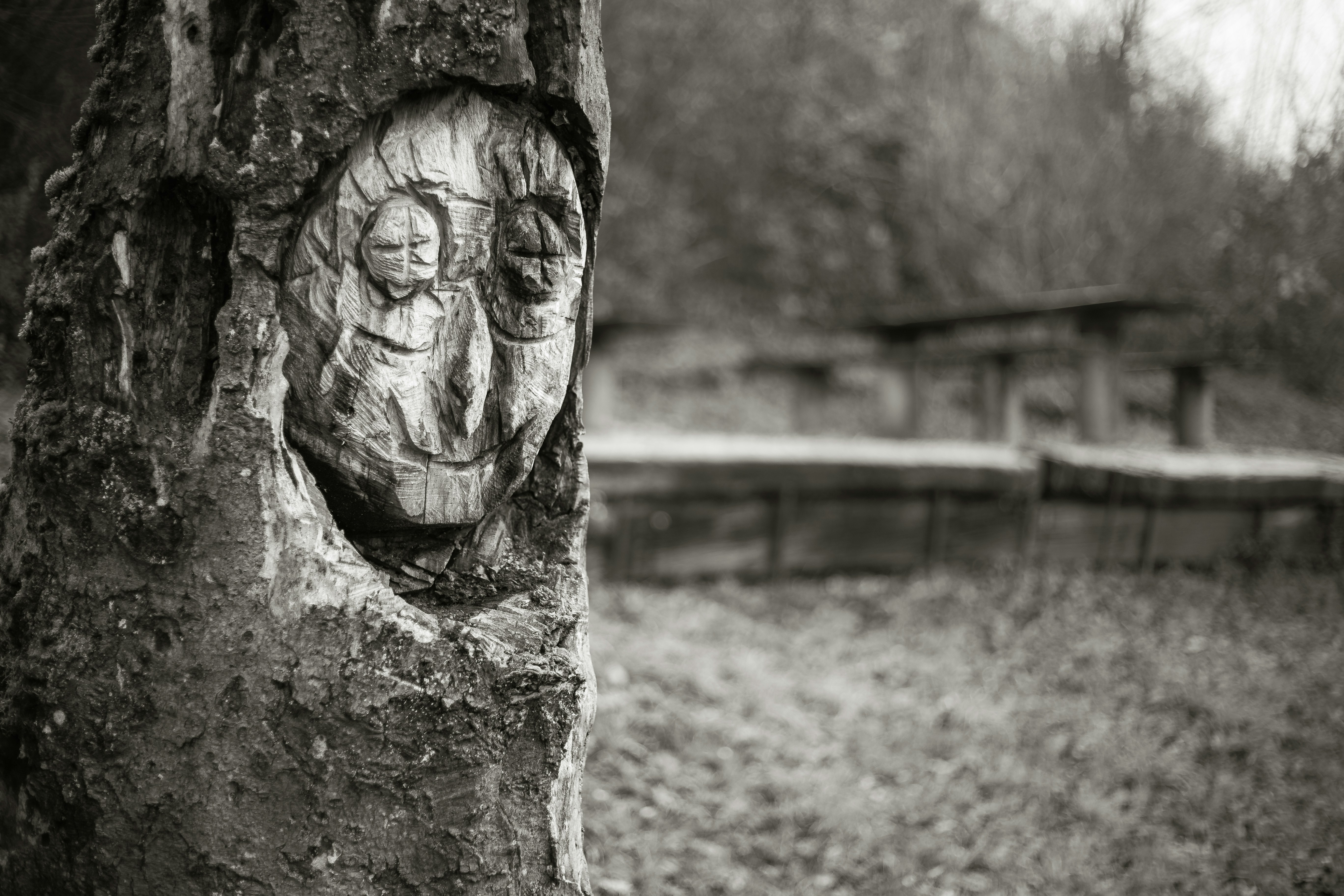Grayscale Photo Of Mans Face Carved On Tree Trunk Photo Free